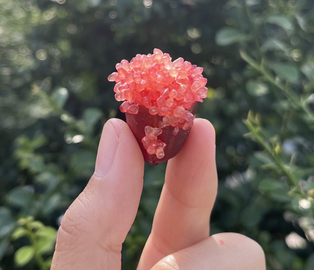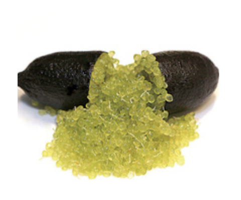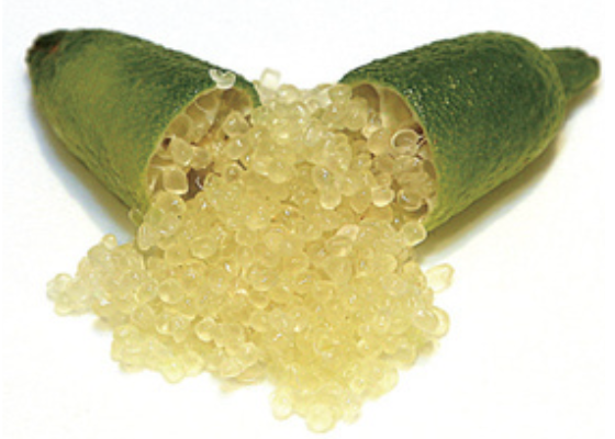 フィンガーライムは、大人の手の指ほどのサイズの果実です。 最大の特徴は、その果肉。皮を割ると、まるでキャビアのようにキラキラとした粒状の果肉が溢れ出し、口の中でプチプチと弾ける独特の食感を楽しめます。